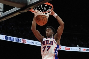 接著,在賈巴里-沃克補(bǔ)籃得手后,埃奇庫姆命中了他個人的第三記三分球,在比賽還剩1分14秒時將比分追至25平。在首節(jié)比賽中,76人最后的16分里有13分是由他得到的。