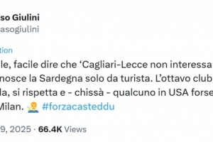 朱利尼寫道:“親愛的卡迪納萊,當(dāng)你對(duì)(卡利亞里主場(chǎng)所在地)撒丁島的了解僅限于游客視角時(shí),說‘沒人關(guān)心卡利亞里對(duì)陣萊切的比賽’會(huì)很容易。作為意大利球迷數(shù)量排名第八的俱樂部,卡利亞里既有觀眾關(guān)注,也備受尊重。而且誰知道呢,在美國(guó),或許支持卡利亞里的人比支持米蘭的還多(注:在美國(guó)有很多來自撒丁島移民的后裔)。”