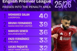 本賽季英超傳球入禁區次數榜:薩拉赫壓B費居首,恩佐、扎卡在列